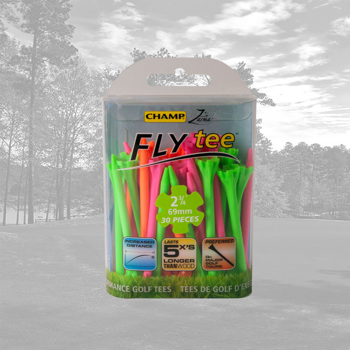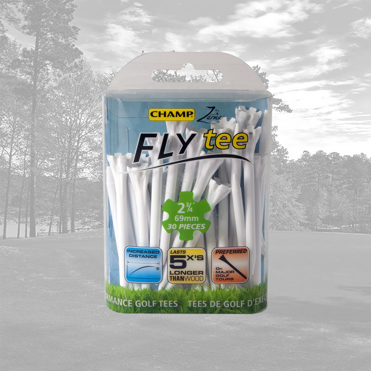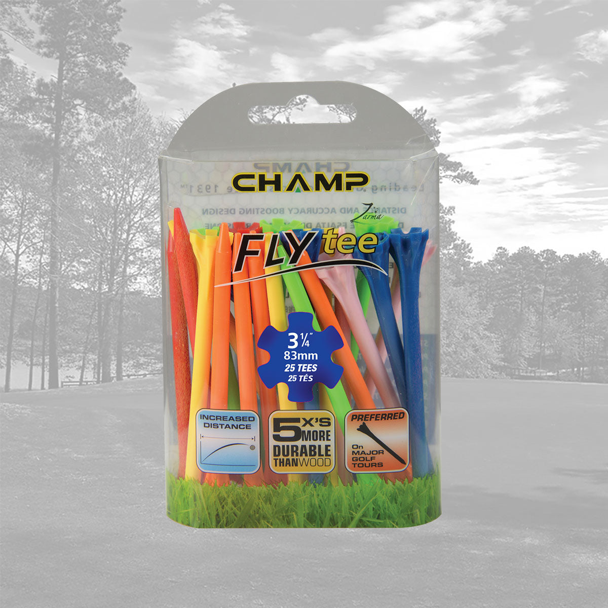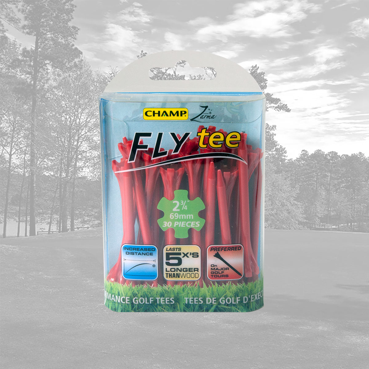 The CHAMP Zarma FLYtee™ is a performance tee that will increase your distance and accuracy from tee to green. Made with a durable plastic design and a 6-prong head it is easier to place the ball on the tee and keep it stable. With its added durability and contoured cup, this tee gives top performance to all golfers, from amateurs to professionals.