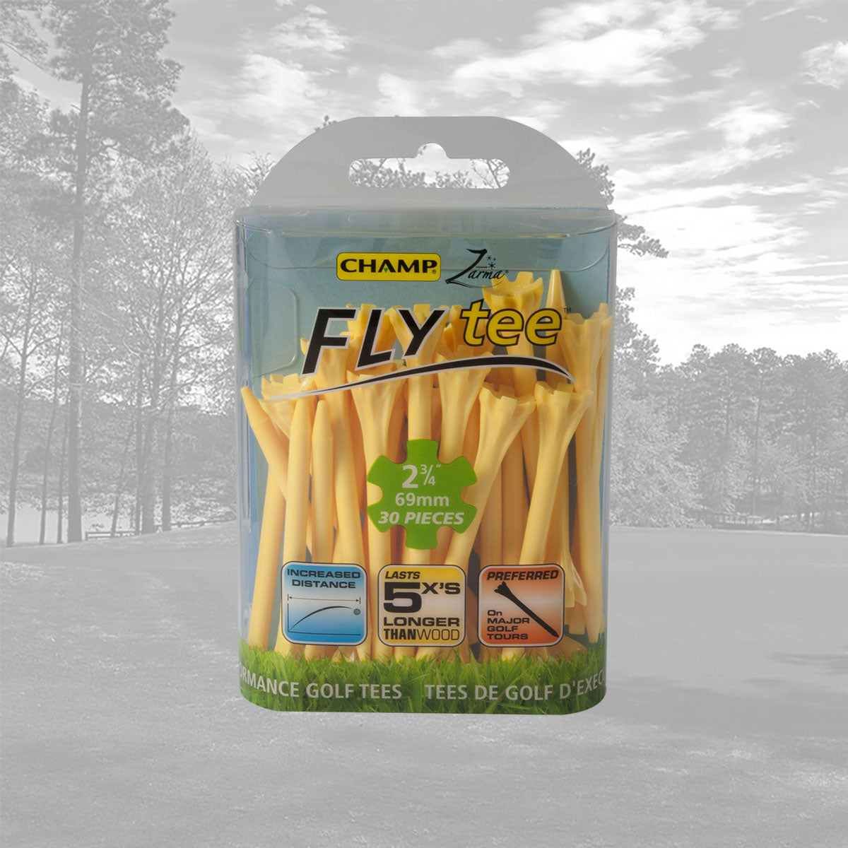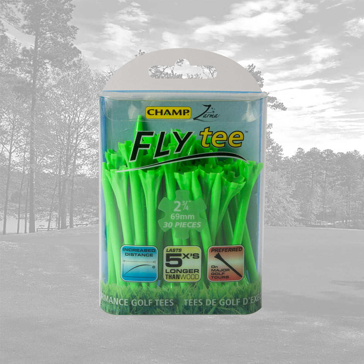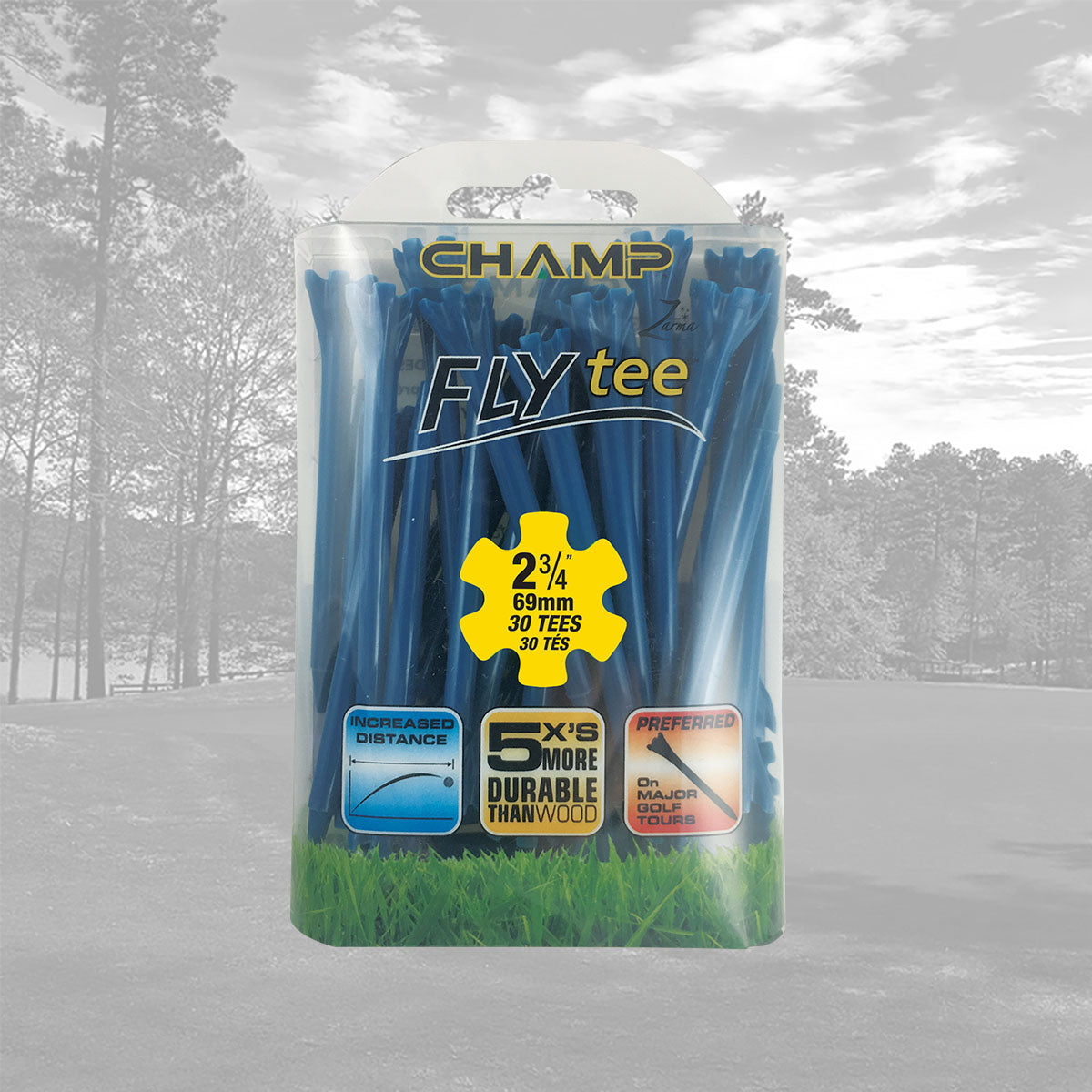 The CHAMP Zarma FLYtee™ is a performance tee that will increase your distance and accuracy from tee to green. Made with a durable plastic design and a 6-prong head it is easier to place the ball on the tee and keep it stable. With its added durability and contoured cup, this tee gives top performance to all golfers, from amateurs to professionals.